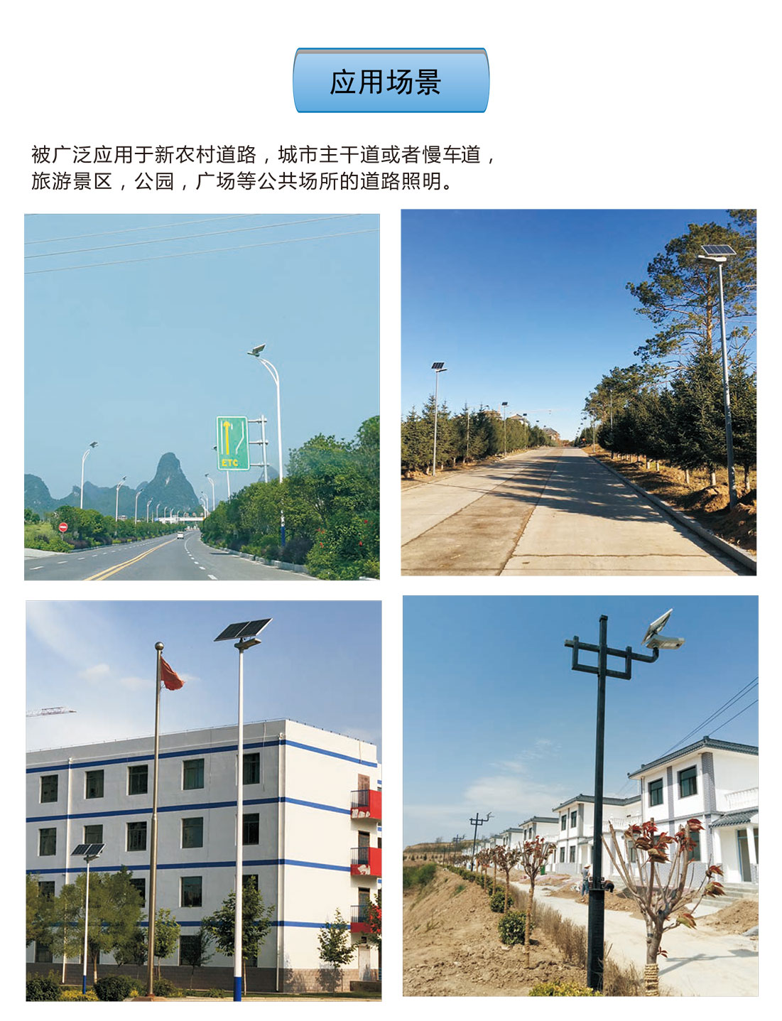 夜鷹燈作為高性價比中高功率一體化太陽能路燈,被廣泛應(yīng)用于新農(nóng)村道路、鄉(xiāng)鎮(zhèn)道路、城市主干道或者慢車道、旅游景區(qū)、廣場、工業(yè)園區(qū)等場景。